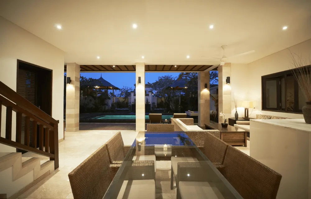Upstairs, the villa’s relaxation lounge overlooks the pool and offers breathtaking views across the water to Lombok, creating a serene retreat for quiet moments.